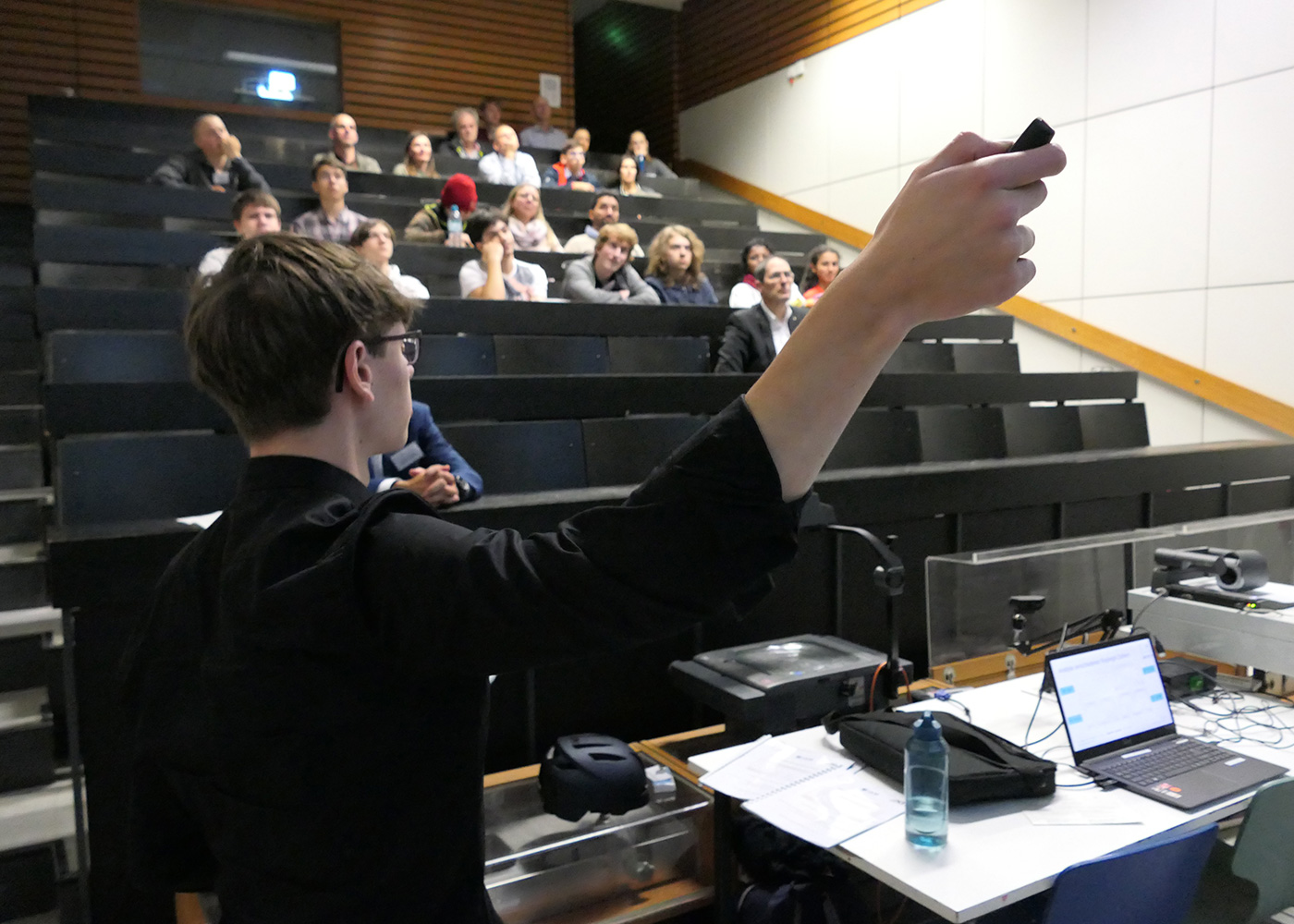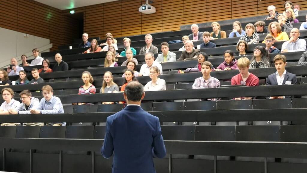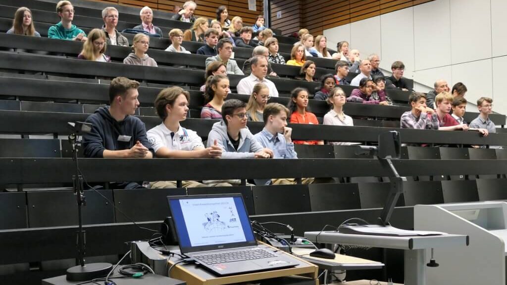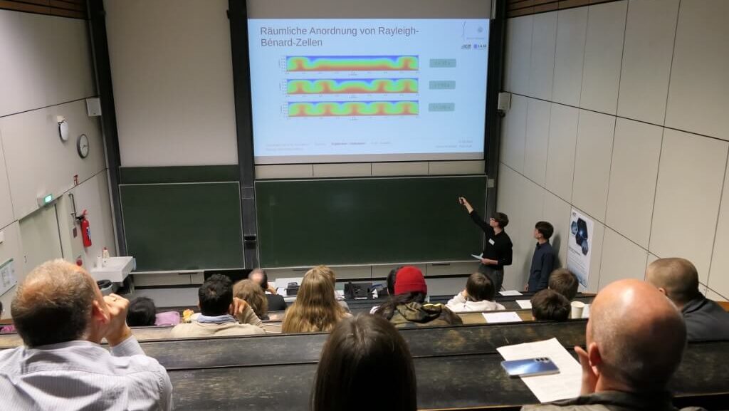 Kursleiter Thomas Knecht, der den Kurs seit Beginn im Dezember 2018 begleitet hat, begrüßte stellvertretend für das Karlsruher Standort-Team die anwesenden Besuchenden, darunter Eltern und Familien, betreuende Wissenschaftlerinnen und Wissenschaftler, Lehrkräfte und Freunde. In zwei parallelen Vortragsblöcken stellten die Hectorianerinnen und Hectorianer ihre Forschungsarbeiten vor und gaben im anschließenden Kolloquium die Möglichkeit weiterführende Fragen zu stellen.