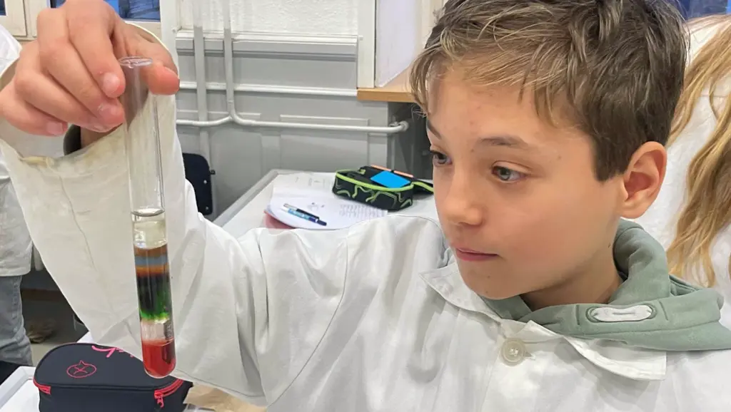 Kittel an, Schutzbrille auf - los geht's? Schön wär's... Das Wichtigste beim Kurzprojekt "Flüssigkeiten schichten" ist neben einer ruhigen Hand ein guter Plan. Denn nur wer vorher genau überlegt, sinnvoll plant und auch ein bisschen Glück bei der Auswahl der Vorversuche hat, kann die Aufgabe bewältigen: In möglichst wenigen Schritten möglichst viele verschiedene bunte Flüssigkeiten in einem Reagenzglas schichten. Das Ergebnis im Kurs KA 25: 9 Schichten. Herzlichen Glückwunsch!
