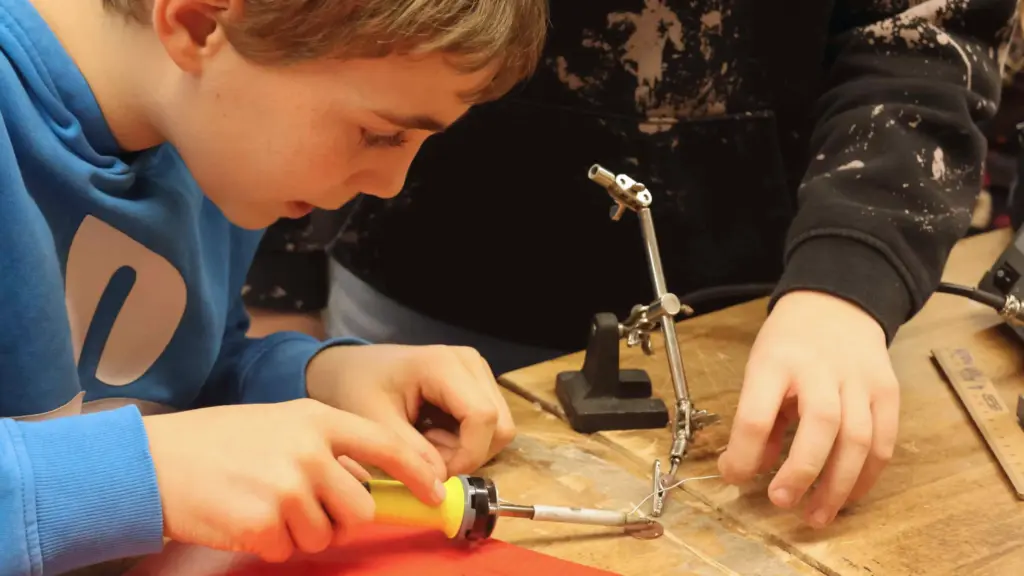 Wenn's an Löten geht, sind zwei Dinge gefragt: Konzentration und Genauigkeit. Noch dazu bei einer komplizierten Aufgabe wie einer FlipFlop-Schaltung. Denn nur wenn die Lötstellen sauber gesetzt sind, blinken die Leuchtdioden wie gewünscht. Dabei reichen zwei Hände manchmal nicht aus - im Kurs KA 25 kein Problem dank Teamarbeit.